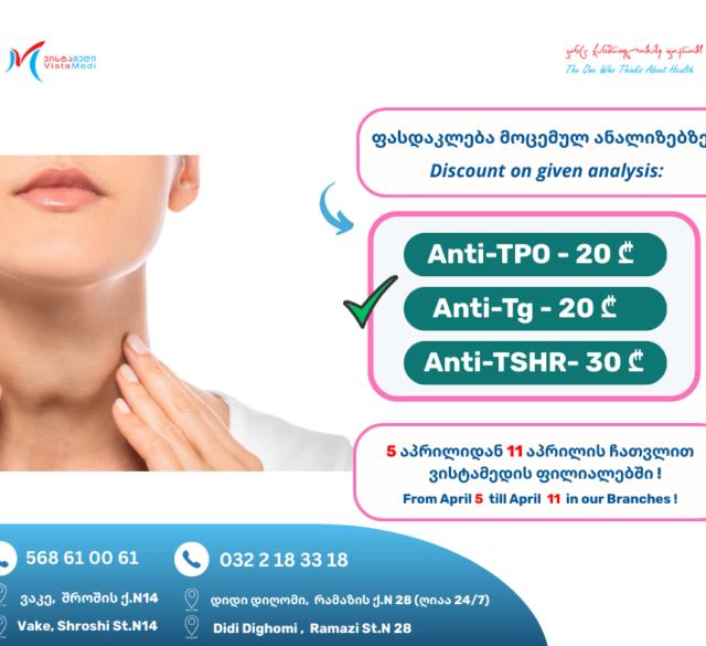 🔬Visit Our Vake and Didi dighomi branch on April 5 till April 11th and get special discount on given analyses : ✅Thyroid peroxidase antibody, Anti-TPO – 20 GEL❗️ ✅Anti-Thyroglobulin, Anti Tg – 20 GEL❗️ ✅ Thyroid stimulating hormone receptor antibodies, Anti-TSHR – 30 GEL❗...